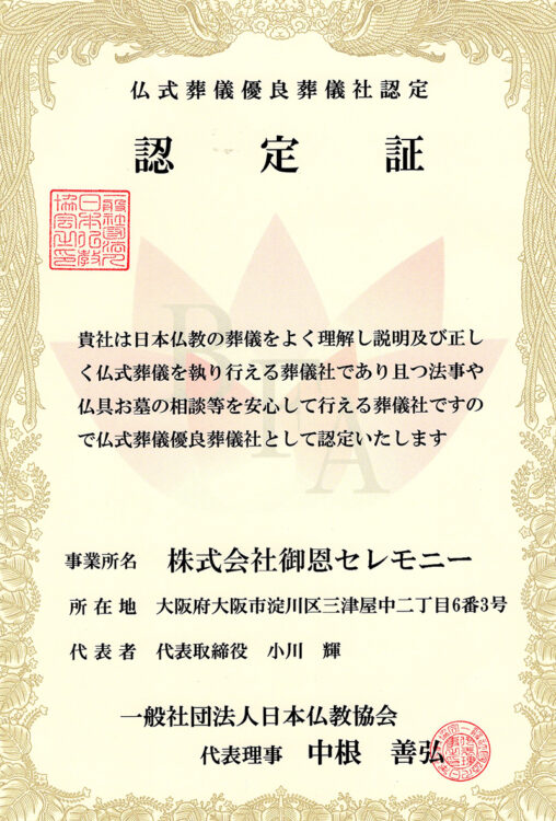 | 会社名 | 株式会社御恩セレモニー 内閣総理大臣認証 第1767号 NPO法人 全国葬送支援協議会 |