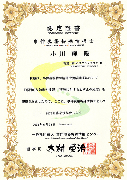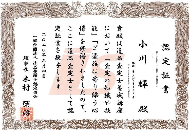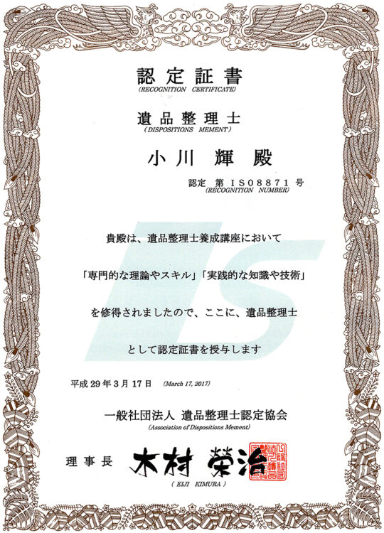 | 役員 | 代表取締役 小川輝 仏教葬祭アドバイザー 遺品整理士 遺品査定士 遺品整理士地区統括会員 事故現場特殊清掃士 |